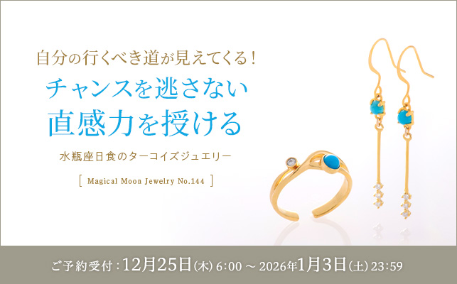 今回のジュエリーは、迷いなくチャンスを掴む直感力を授ける「水瓶座日食のターコイズジュエリー」。アチューンメントの1回目として、本日2月2日の獅子座満月の波動を宿しました。